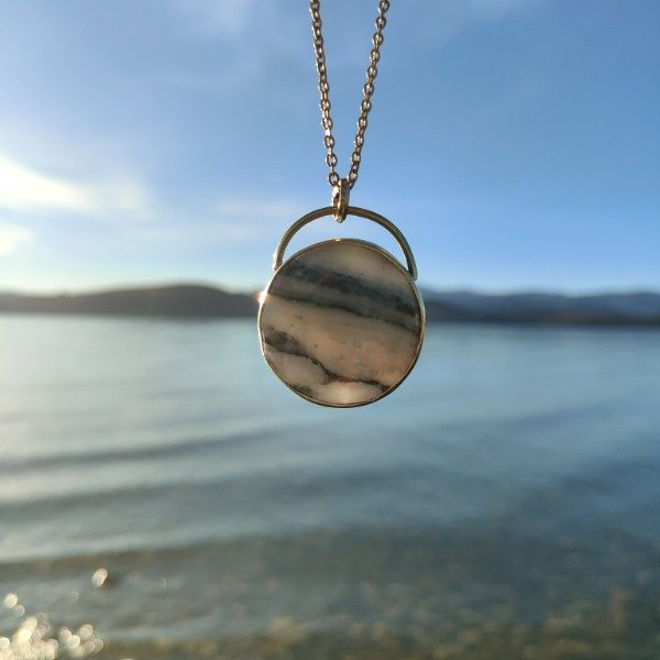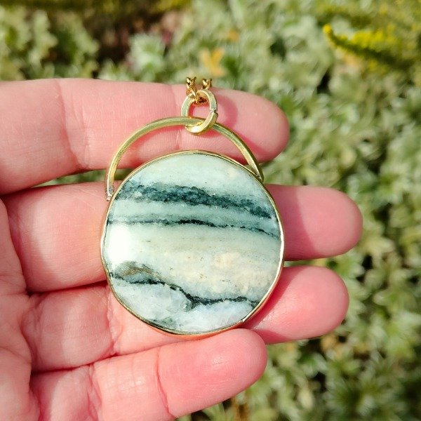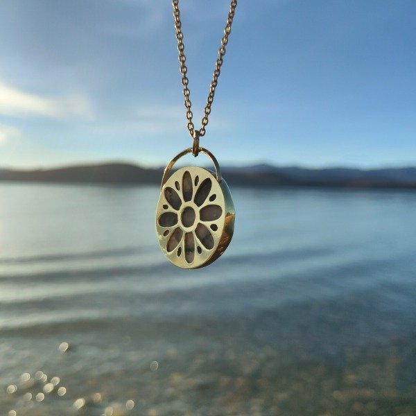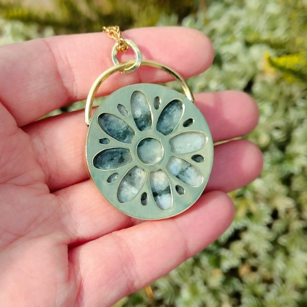 Colgante de bronce con piedra Trinita, con un diseño calado atrás de mandala que hace que el colgante se pueda usar de ambos lados!