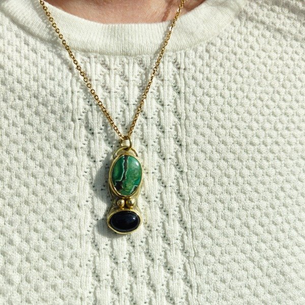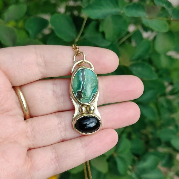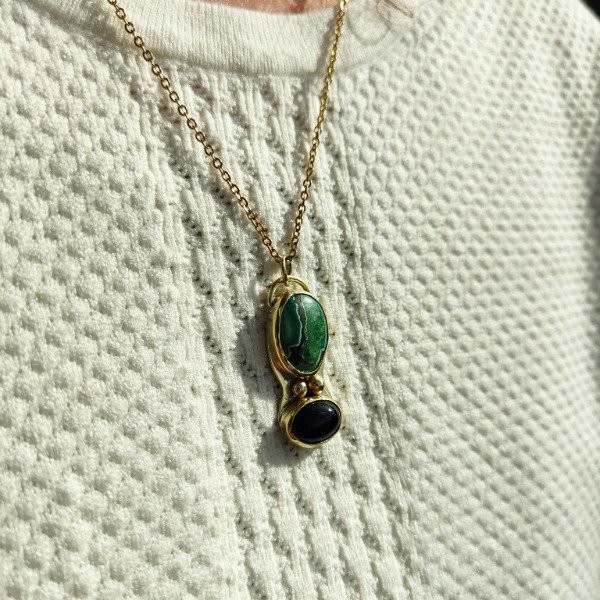 Este colgante es una pieza única. Tiene 2 piedras engarzadas y bolitas de bronce.